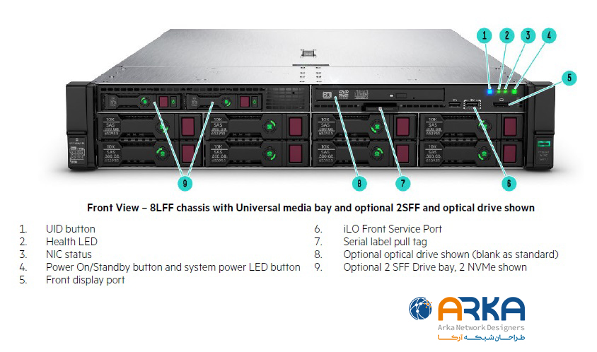 از نظر ظاهری، سرور دارای پنل جلویی با جایگاه درایوهای LFF و SFF است و بسته به نیاز میتواند پیکربندیهای متفاوتی را پشتیبانی کند. همین انعطافپذیری یکی از دلایل انتخاب گسترده این سرور توسط سازمانها و دیتاسنترهاست.