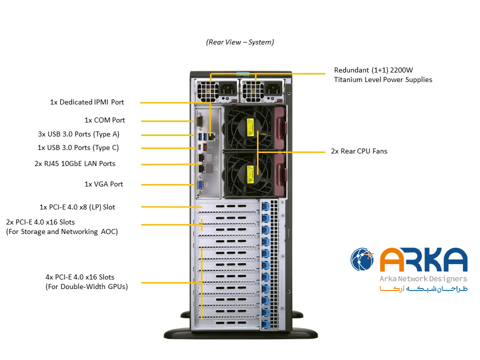 بررسی Supermicro SYS-740GP-TNRBT نشان می‌دهد که سیستم خنک‌کننده آن شامل 4 فن قدرتمند است که جریان هوای لازم برای پردازنده‌ها و GPUها را تامین می‌کنند. منبع تغذیه نیز یک پاور 2200 وات ریداندنت با راندمان 96% (سطح Titanium) است که توان و پایداری بسیار بالایی را برای پردازش‌های طولانی‌مدت تضمین می‌کند.