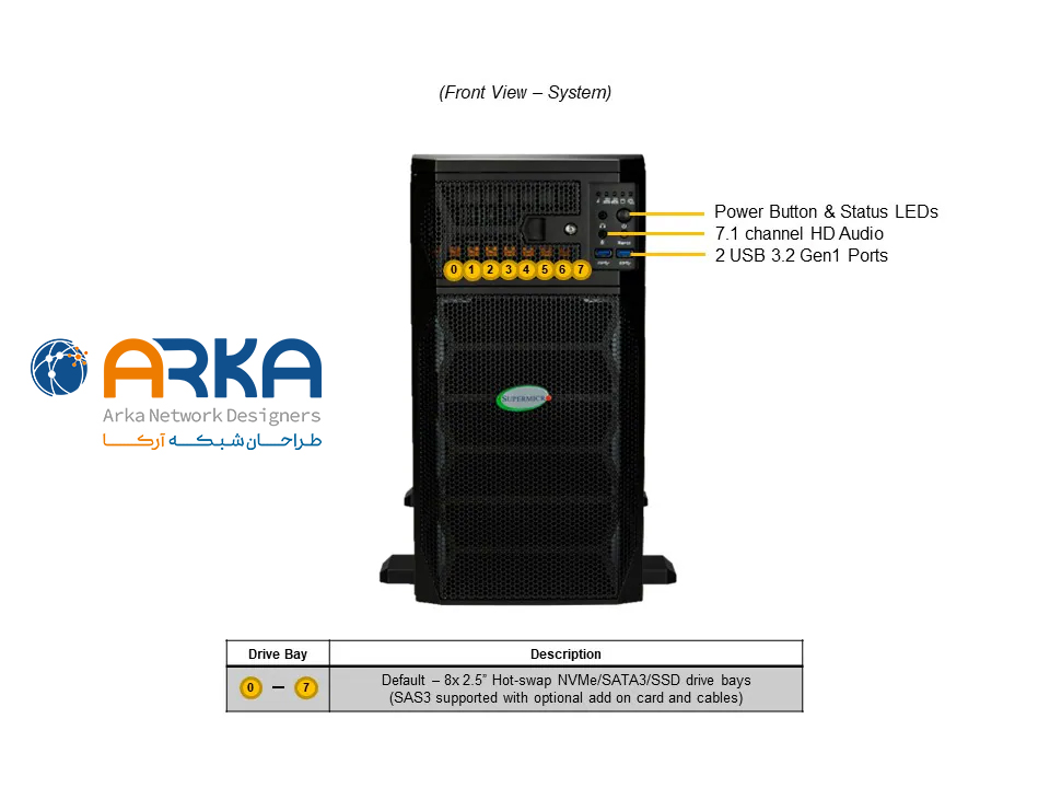 پشتیبانی از 8 درایو 2.5 اینچی NVMe/SAS/SATA با قابلیت Hot-Swap از مهمترین ویژگیهای این مدل است. همچنین 2 اسلات M.2 NVMe نیز برای ارتقاء سریع و انعطافپذیر تعبیه شده است.