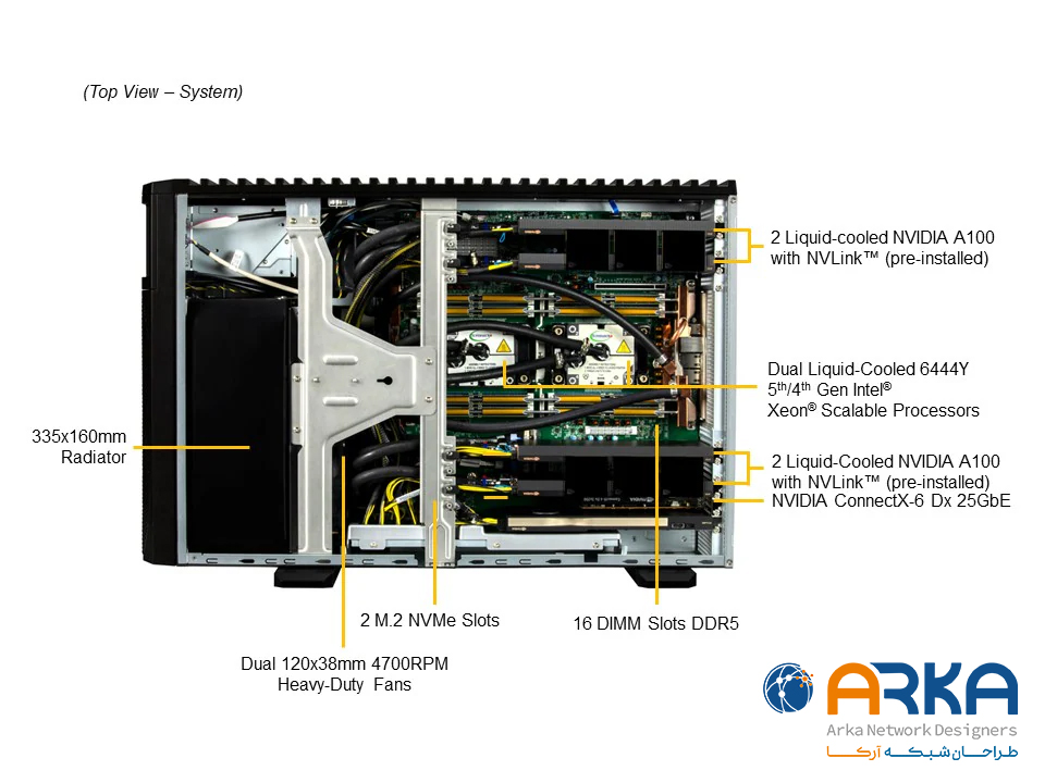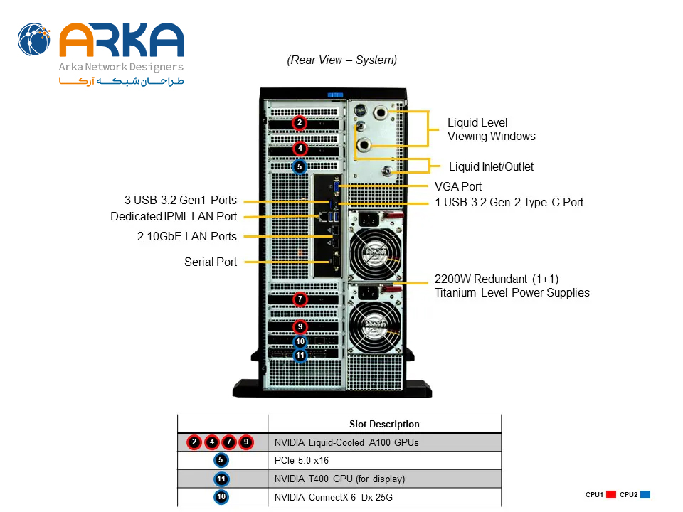 سیستم خنککننده شامل 1 فن 8cm و 2 فن 12cm است و امکان استفاده از Liquid Cooling نیز فراهم شده است. منبع تغذیه 2200W Redundant Titanium با راندمان 96% تضمین میکند که در شرایط کاری سخت، پایداری سیستم حفظ شود.